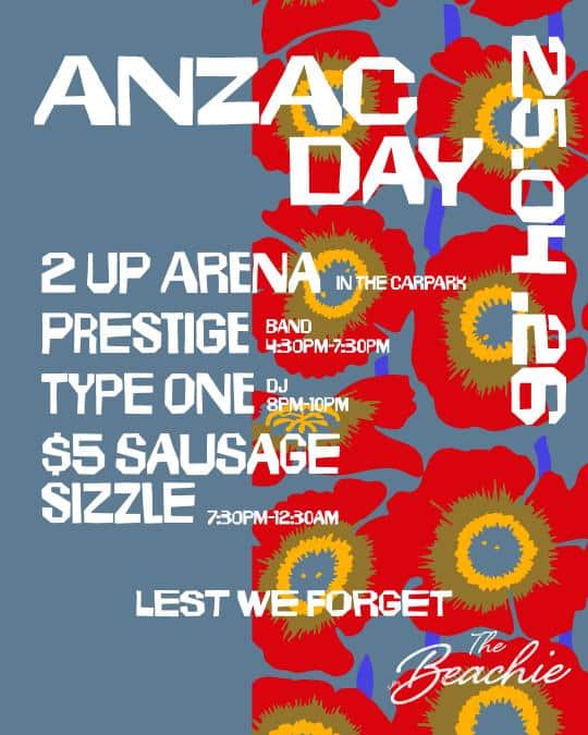 On Saturday, the Beachie carpark will host our traditional Two-Up arena alongside a $5 sausage sizzle BBQ. The afternoon continues with a live band from 4:30pm before the DJ takes over into the evening.