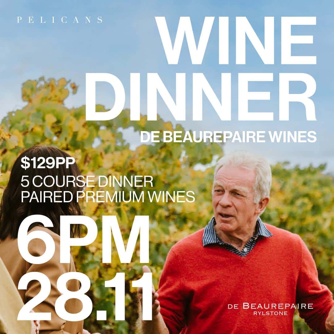 Enjoy a five-course dinner at Pelicans. paired with elegant De Beaurepaire wines from Rylstone, French heritage and lakeside charm in every glass.